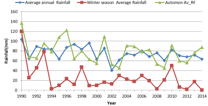 Figure-8. Average annual rainfall, winter and autumn average rainfall of Merti district (1990-2014). |
