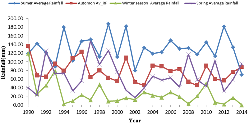 According to the station data there has been a decreasing trend in the four seasons’ average annual rainfall over the last elapsed periods of 24 years from 1990 - 2014. As shown in figure 10 below, the four seasons’ average annual rainfall for the study area coincides with each other.