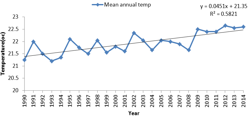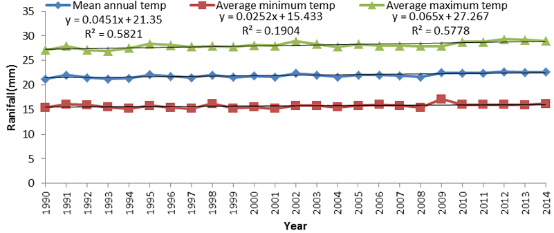 The mean annual variability in temperature as the result obtained from the analysis of meteorological station data gathered from the district revealed greater year to year temperature variability. As the figure (Figure 11) below tell us the local temperature once go up while it go down in the other occasion for some of the years even though it shows continuous general increase. There is a 0.05 0 C increase in the annual average temperature since the last 24 years (1990-2014). The district would probably remained cool during the years 1990, 1993 and 1994 whereas 1991, 1995, 1998, 2003, 2005, 2006 and 2007 were warmer seasons comparing with the years 2002, 2009, 2010, 2011, 2012, 2013 and 2014 showing warmest weather conditions in the district. The temperature trend analysis for the lately occurring years ahead of 2009 showed that an increasing local temperature which involves the district’s existence in an increasing warming situations when we compare with the years long ago to the beginning of the data. Generally speaking, average temperature of the study site can be concluded as just showing absolute increase in an alarming rate although some sorts of similarities in recorded value observed during the time periods of 1992, 1997, 1999, 2001, 2004 and 2008, the average temperature of the study site shows almost similar records constant with a constant increase while the rest of the years depicted inconsistency.