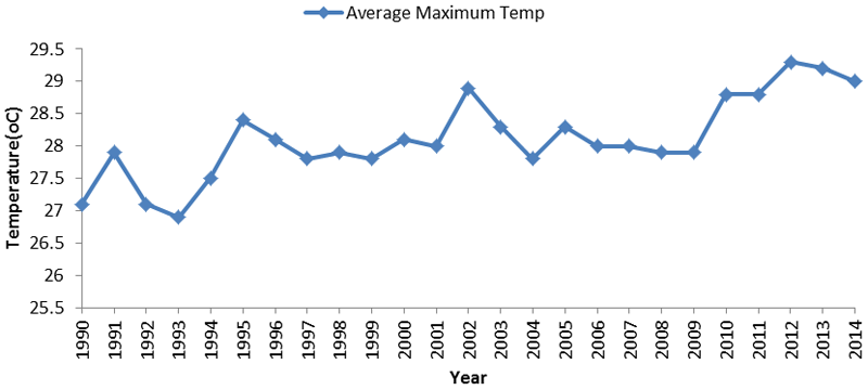 Figure-12. Year to year variability in average annual maximum temperature of Merti district (1990-2014). |