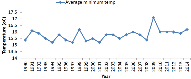 In addition to the increase in the maximum temperature the minimum temperature over the district also show increasing trend as well (Figure 13). There is a 0.03 0 C increase in the Marti’s minimum annual average temperature since the last 24 years (1990-2014).