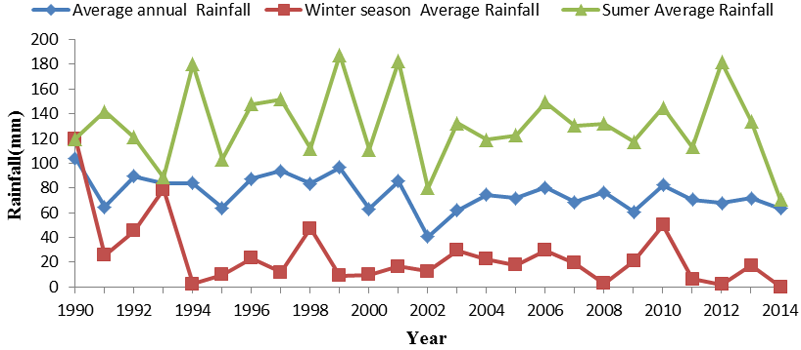 Figure-9. Average annual rainfall and, summer and winter seasons’ annual average rainfall (1990-2014) of Merti district. |