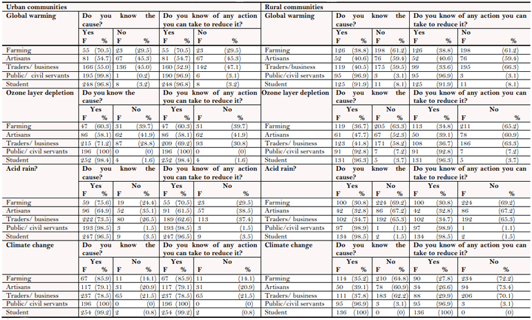 In order to assess the awareness and sensitization levels of the public about environmental issues and obtain an all inclusive public participation in decision making process for planning attempts, descriptive survey research design was adopted for the study [10]. The five major stakeholders (artisans, public/civil servants, farmers, students and traders/business) in the state selected for this study constituted the major strata from which sampling of sub-stratum that makeup the respondents were taken. A total of 14 communities (7 in the urban/semi urban local governments and 7 in the rural local governments) were studied using the stratified sampling technique. A total of 2000 questionnaires were administered through face to face interview among the stakeholders that constituted the sample; 1000 for urban communities and 1000 for their rural counterparts. This ensured that the researchers achieved a response percentage of 98% which was higher than any other expected methods to be employed. A test questionnaire was developed in reference to the subject in order to measure the knowledge level of the stakeholders about the environment and environmental issues. The instrument was sectionalized into two aspects. The first section was designed to obtain demographic information of respondents whereas the second aspect seeks to elicit direct responses from respondents on level of awareness on environmental issues confronting the state. Descriptive statistical methods were employed in the analysis of data. Descriptive here refers to the usage of contingency table in analyzing the level of awareness among the sampled stakeholders.