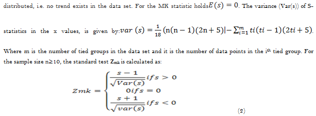 In Equation 2, Zmk is used to evaluate the trend. Positive ZMK indicate increasing trends, negative ZMK values reflect decreasing trends. The presence of a statistically significant trend is evaluated using the ZMK value. Z1-α/2 is the critical value of ZMK. For 5% and 10% significance level, the value of Z1-α/2 is 1.96 and 1.64 respectively Equation 2. It is not affected by missing data, insensitivity to extreme values and better performance even for normally distributed data. Then, the slope (change per unit time) was calculated as: