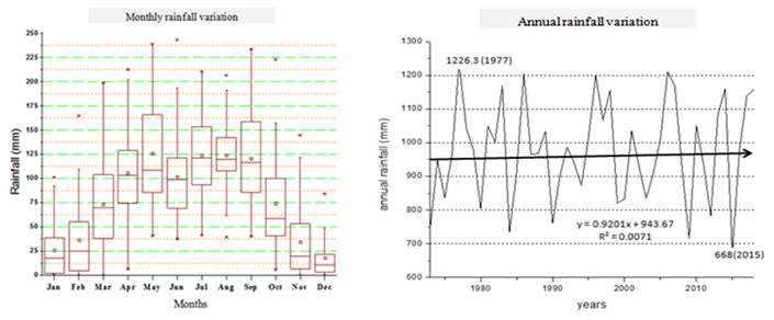 Figure-2. Monthly climatology (Boxplot (Box=25 to75%, whiskers line=up to 10 to 90% and Dots= min & max)) and annual trend of rainfall for Hawassa station (1973-2018).