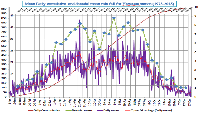Figure-3. Daily mean cumulative and decadal rainfall for Hawassa station from 1973-2018.