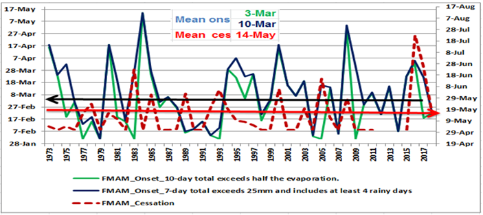 The average onset date was in the 1st decade of March and cessation date was in the 2nd decade of May during the Belg (FMAM)season in the study area for the period. Figure 6 shows the high variability of onset than offset date of rainfall. Therefore, the mean onset date (03 March) could be taken as a reference for early land preparation and dependable planting date for long growing crops at and around Hawassa. On the other hand, the Belg rainy season offset after 1st decade of May therefore, decisions related to harvesting of short growing crop could be made more easily Figure 6.