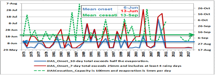Figure-7. Onset and cessation of Kiremt rainy season for Hawassa station (1973-2018).