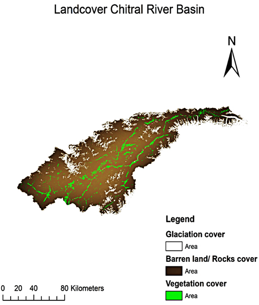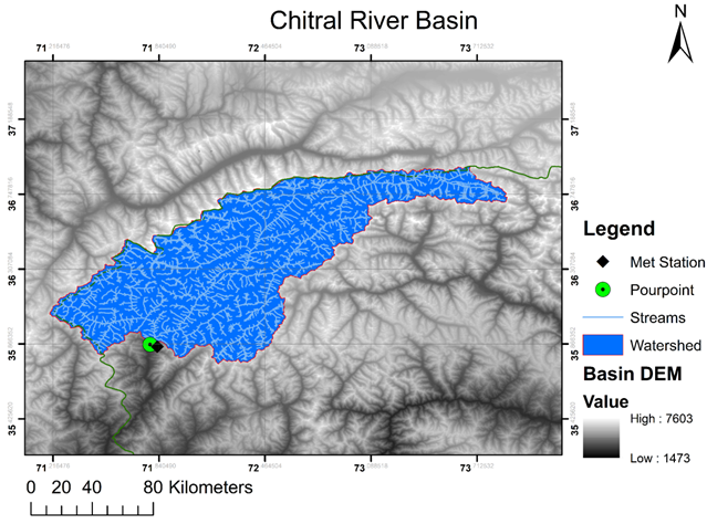 The study area was targeted over the CRB located at the north-western realms of Pakistan with geographical coordinates ranging between 71–74° East Longitude and 36–37° North Latitude Figure 1. It bordered Afghanistan to the west and hosted a significant drainage system in the Hindukush Region. The CRB drained in to the Kabul River which was a sub-catchment of the greater Indus River Basin. The flow of the CRB comprised of snowmelt water and small to large scale glaciers located downstream [15]. Our calculated surface area of the CRB was 12400 Km2 at the pour point. It held major portion of the glacier cover of the Hindukush range and constituted nearly 10–13% of its area as glacier. Of our calculated magnitudes of areas, vegetation zone covered approximately 10751 Km2, barren land covered approximately 423 Km2 and glaciated zone covered approximately 1226 Km2 of the basin. Elevation of the basin ranged from 1473 m ASL (Above Sea Level) to 7603 m ASL. For the period of our analysis, average temperature was calculated as 16.3°C, average precipitation as 469 mm/year and average flow as 108067 m3/year over the basin. The CRB has remained prone to climate related hazards like temperature triggered glacier lake outburst floods which contributed significantly to the flow regimes especially in summer season over the basin (see e.g., Burhan, et al. [16]).