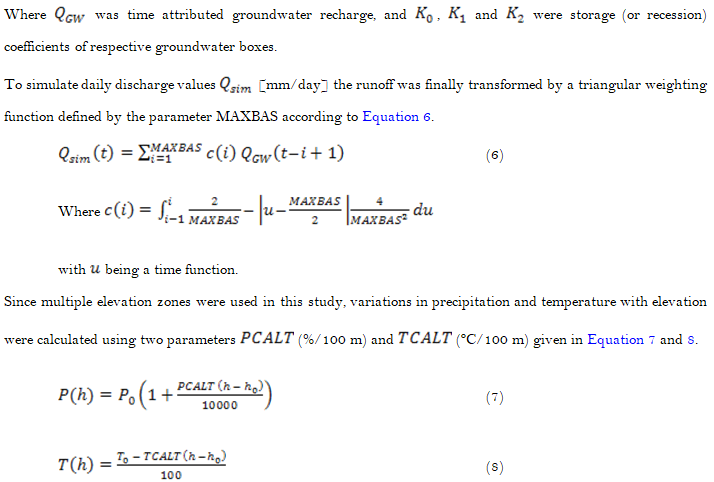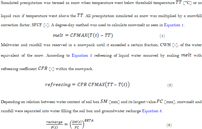 In current version of the HBV, snow melt routine along with glacier ice melt and accumulation were deployed. Moreover, to present effect of different expositions on snow and ice melts, a spatial discretization in aspect classes including South, North and East–West-Horizontal was introduced. Glacier ice melt was simulated using similar degree-day method as of snow, however with the degree-day factor being increased for the melting of ice as compared to snow due to its lower albedo. Since the CRB constituted of 10–13% glaciers whose melt is a major contributor to its stream flow, the selected model was found viable to be applied over the glaciated watershed.