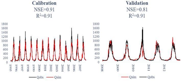Figure-4. Emulation of calibrated and validated flows of the CRB with NSE and R2 values representing high efficiency in model predictions.