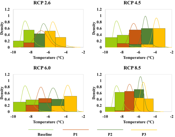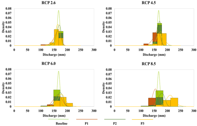 Probability density functions were modelled owing to their advanced type of statistical measuring function with applications in climate change and its diagnostics (see e.g. Burhan [23]). The density functions provided to correlate random occurrences to their probability. Since probability density function helped calculate cumulative distributions, we engaged it for calculation of flow and temperature densities in order to rationalize attributions of changing patterns over the projections. Thereafter, based on the fitted distribution, frequencies, relative frequencies, and densities for the changes in projections were computed.