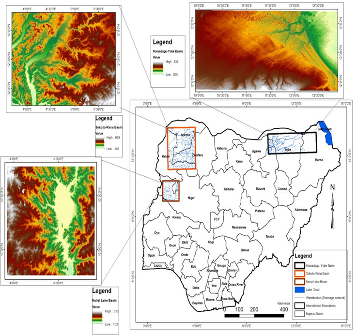 The coordinates of each of the three basins namely: Kainji Lake Basin (KLB), Sokoto-Rima Basin (SRB) and Komadugu-Yobe Basin (KYB) were used to derive the extreme rainfall indices considered herein Table 1. Projections were produced for three future periods namely: near-term (2019-2048), mid-term (2049-2078) and long-term (2079-2100) using the multi-model ensemble mean of CMIP5 GCMs under RCP2.6, RCP4.5 and RCP8.5 with references to the 1959-1988 and 1989-2018 baselines.