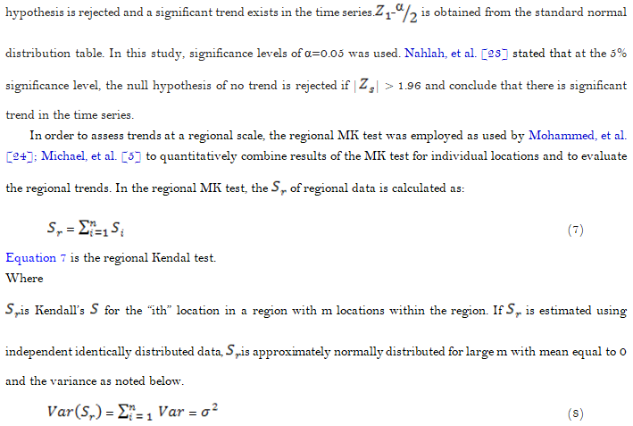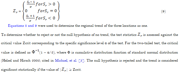 To achieve part of objective, Mann-Kendall test [19, 20] was applied to detect the monotonic trends in projected water yield time series. The Mann-Kendall statistical test has been frequently used to quantify the significance of trends in hydro-meteorological time series [21-23]. This is calculated as: