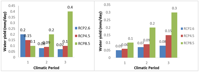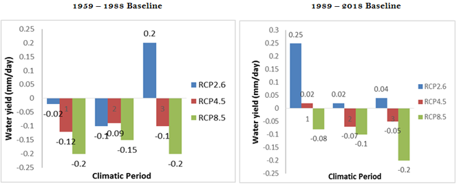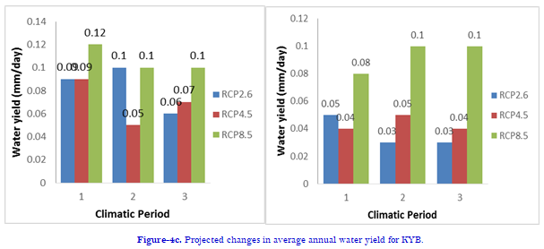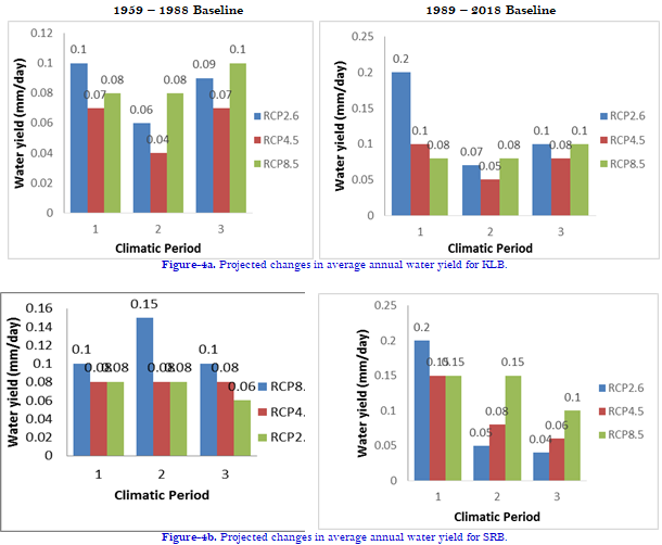 Trend analysis in SRB under the 2019-2048 periods Table 2 shows no significant increasing trends at 0.05 significant levels for all the three emission trajectories. Likewise, in KYB average annual water yield reveals (+0.09 to 0.12 mm/day) range of increase under the 1959-1988 baseline for all the RCPs, but sharply decreases to the range of (+0.05 to +0.08 mm/day) under 1989-2018 baseline with RCP8.5 having the highest value and least being RCP2.6. However, the trend analysis over KYB under the (2019-2048) period shows that there are no significant increasing trends for all the three RCPs at 0.05 significant levels.