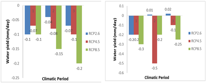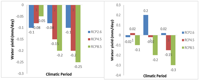 The near-term (2019-2048) projection shows that dry season water yield will decrease across the KLB, SRB and KYB with reference to the two baselines of 1959-1988 and 1989-2018 as well as under the RCPs 2.6, 4.5 and 8.5 Figure 2a-c. Condition observed in KLB indicate that water yield will decrease within the range of (-0.02 to -0.2 mm/day) for all the three RCPs under the two baseline periods of (1959-1988) and (1989-2018). RCP8.5 accounts for the highest decrease of (-0.2 mm/day) and lowest being RCP2.6 with (-0.02 mm/day) under the 1959-1988 baseline, while a contrasting pattern of increase is observed under 1989-2018 baseline for RCPs 2.6 and 4.5 which ranges from (+0.02 to +0.25 mm/day) but decreases by (-0.08 mm/day) for RCP8.5. Table 2 trend analysis of dry season water yield confirms no significant decreasing trend at 0.05 significant levels.