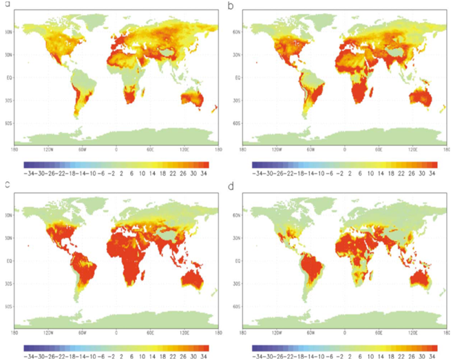 Figure-4. Mean Global Heat Load and Threshold (a) heat load, (b) moderate heat load, (c) strong heat load and (d) extreme heat load at 12 MLT taking acclimatization into account, based on ECHAM4/T106-data.