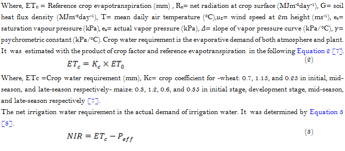 Where, NIR=Net irrigation water requirement (mm), Peff= effective rainfall which is part of rainfall is used for plants and it was assumed 70% of rainfall [9].