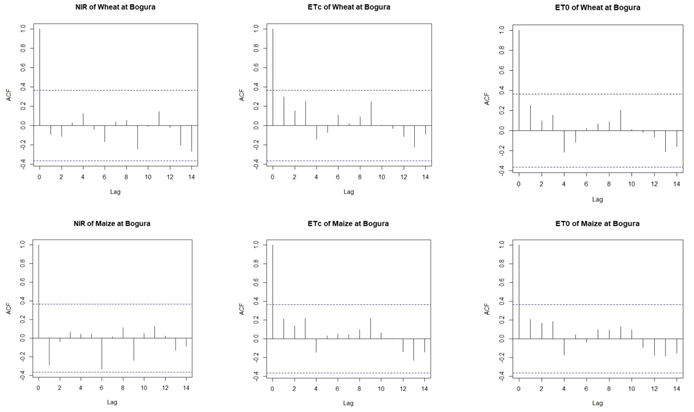 Figure-4. Autocorrelation (ACF) of net irrigation water requirement (NIR), crop water requirement (ETc), reference evapotranspiration (ET0) with different lags at Rajshahi and Rangpur from 1990 to 2018.