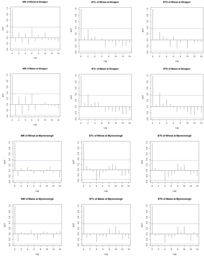Figure-3. Autocorrelation (ACF) of net irrigation water requirement (NIR), crop water requirement (ETc), reference evapotranspiration (ET0) with different lags Dinajpur and Mymensingh from 1990 to 2018.