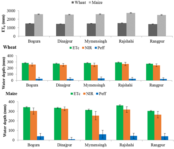 Reference evapotranspiration (ET0) during wheat and maize cultivation was the lowest (1420mm and 2500mm respectively) at Rangpur and highest (1552mm and 2737mm respectively) at Rajshahi Figure 5 because the temperature at Rajshahi was higher than Rangpur. Mojid, et al. [13] showed the evidence of the similar results. The crop water requirement of both wheat and maize ranged from 268mm at Rangpur to 292mm at Rajshahi and 302mm at Rangpur to 360mm at Rajshahi respectively. The results were coincident with Schulthess, et al. [14] which studied in coastal areas in Bangladesh. Net irrigation water requirement of wheat and maize was also high (266mm and 318mm respectively) at Rajshahi since the temperature was higher and effective rainfall is lower than any regions.