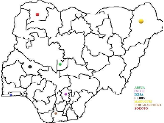 The dataset of rainfall used in this study was acquired from the Nigerian Meteorological Agency (NIMET). For the cities of Enugu, Abuja, Enugu, Ikeja, Ilorin, Maiduguri, Port Harcourt, data for the total of 31 years (1980 - 2010) was collected, and for Sokoto, data for the total of 29 years (1982 - 2010). These cities represent the six geographical zones of Nigeria. The summary of the data collected is shown in Table 1. In this study, we study the parametric analysis (trend analysis) of rainfall variability over some selected locations in Nigeria and determine the trend using surface observation data from seven weather stations, (one station from each of the six geopolitical zones in Nigeria). The stations used for this study is highlighted in the Figure 1.