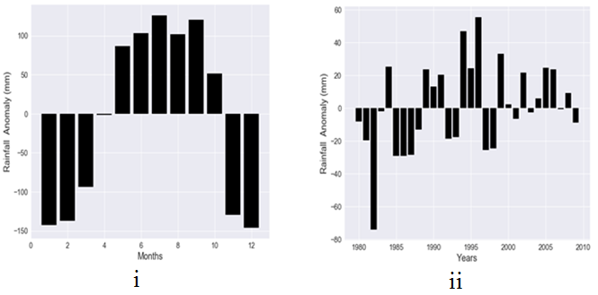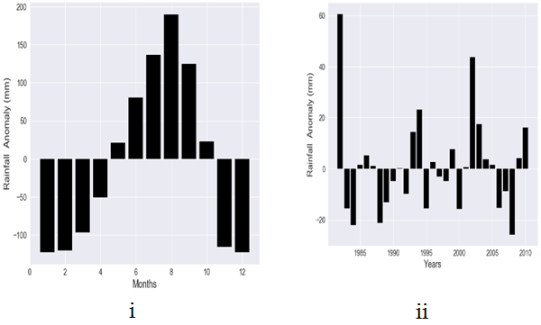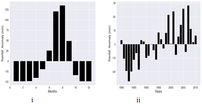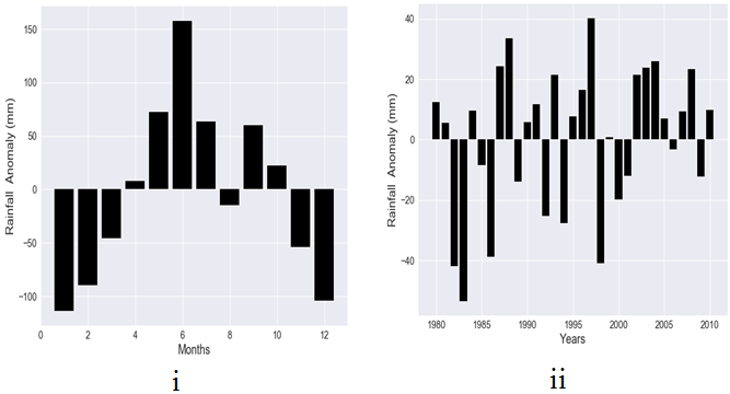 Figure 14 represents the plot of both monthly and yearly rainfall anomalies. From figure 14 i and ii, the negative deviation of rainfall that occurred in non-rainfall months (November to April) was equally as prominent as the positive deviation of rainfall that occurred in rainfall months (May to October), was the same. It was observed for the years that between the years 1980 to 2010, the negative anomaly of rainfall was less prominent than the positive anomaly of rainfall.