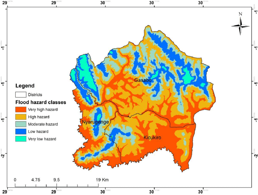 The records were taken in five years. In both years, there was a variation of rainfall that led to the variation of the impacts from floods that occurred at different prone areas of Kigali city. Through analysis of data on the goal of flood forecast issues, for advance warning about severity of flood hazard and Also to help authorities to approve the measures.  The adaptation/mitigation of adverse impacts of flood was referred on magnitude of flood hazard in three districts to establish risk reduction mechanism.