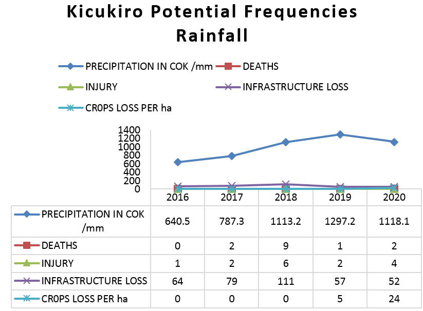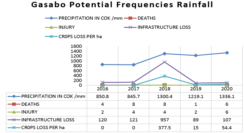 The increase of rainfall tendency in East Africa particularly, to Rwanda and Burundi projection on intensity both in rainy seasons; which is likely to trigger the storms and floods that can resulting to the crop losses, health risks, landslides and impairment of infrastructures, natural ecosystems and rivers overflow [23].  From 1970 to 2050s projections, the average rainfall in Rwanda may increase up to 20% annually [2]. In trends analysis from 2016 to 2020, The precipitation in NYARUGENGE district records was on top rainfall in 2018 with 1528 mm with potential rainfall frequency was in NYARUGENGE with 4 times frequency respect the remains two, followed by GASABO with 4 times compare with KICUKIRO with 1 times potential rainfall. The projection of international monetary fund(IMF) showed that the natural disasters from climate change was actively increased in intensity and frequency respect to their negative impact to the socio-economic activities and also disasters tend to rise moderately [24].