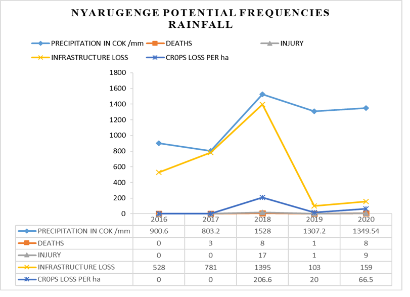 The Pearson correlation coefficient between precipitation and infrastructure losses, death, crops loss per ha, injury was positive correlation meant the increase of precipitation tended to raise the damage both. NYARUGENGE urbanization tied with population growth upsurge flood risks as in urban areas. Urbanization affected the land through, covered by roads, buildings, drainage networks which change the permeable land into the impermeable land with less infiltration capacity to store rainwater and snowmelt, this impermeable land accelerate runoff, rise peak flow in the drainage channels and ends up by activating flood downstream [21].