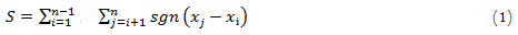 Equation 1 represents the calculation of the number of inversions in a given set of values (xᵢ) indexed by i and j. Where n is denoted as the number of data points, xj, and xi are the data values in time period i and j (j>i), respectively and sgn(xj−xi) is the sign function, presented as: