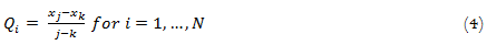 Equation 4 represents the calculation of a sequence of values Qᵢ for i = 1, 2, ..., N, given a set of values indexed by j and k, where xj and xk are the data values at times j and k (j>k), respectively. If there is only one datum in each period, then , where n is the number of periods. If there are multiple observations in one or more periods, then , where n is the total number of observations.