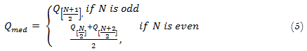 Equation 5 represents the calculation of the median of a sequence of values Qᵢ, where i = 1, 2, ..., N. The Qmed sign reflects data trend reflection, while its value indicates the steepness of the trend. To determine whether the median slope is statistically different from zero, one should obtain the confidence interval of Qmed at a specific probability. The confidence interval about the time slope [25] can be computed as follows: