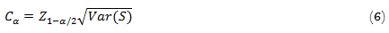 Equation 6 represents the calculation of the confidence interval (C_α) for a random variable S, where Var(S) is defined in Equation 6 and Z1−α/2 is obtained from the standard normal distribution table. This study computed the confidence interval at two significance levels (α= 0.01 and α=0.05).