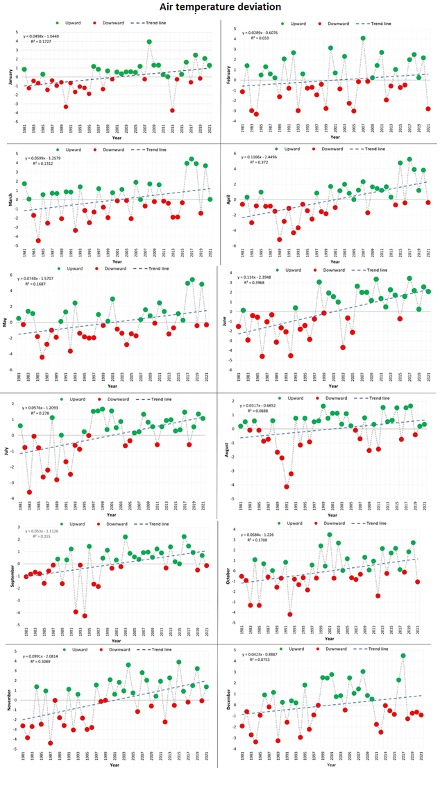 Eventually, for graphical representations of these data, the monthly averages were aggregated into yearly averages and depicted in Line Charts to demonstrate linear trend lines. Values in the positive range were displayed in green, while those in the negative range were displayed in red. Each parameter's resulting Line Chart was composed separately. Three composites were produced for each parameter (each composite includes four months) that helped to identify the ocular relations and variations in data for different months of the time series data.