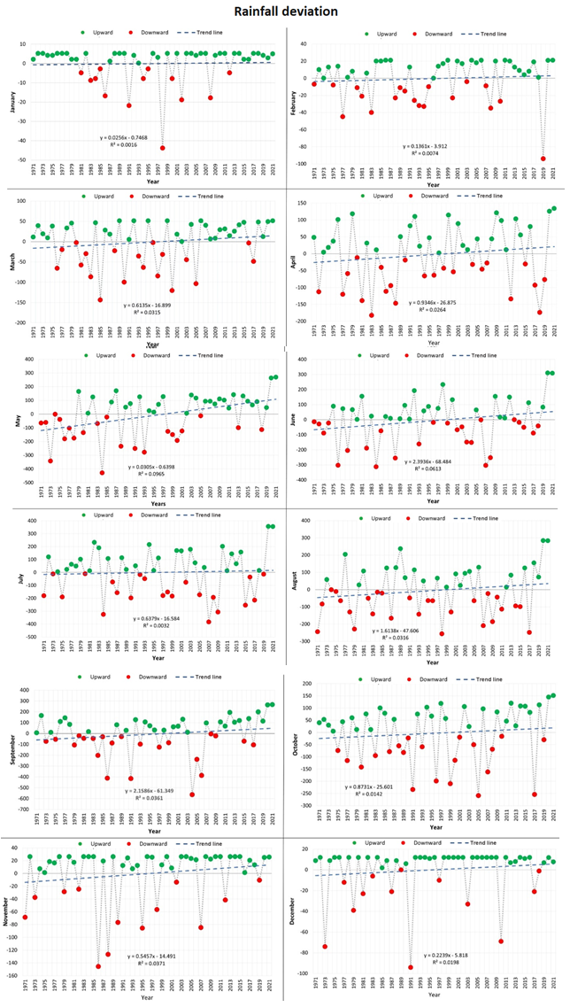 Over the past five decades, there has been an upward trend in the yearly rainfall rates spanning from 1971 to 2021. The average monthly rainfall data analysis indicates that the monsoon season had the highest rainfall, while the winter season had the lowest average rainfall.