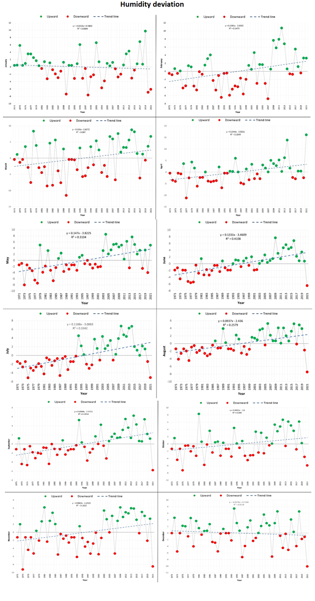 The trend of increasing humidity over the past five decades is evident from the annual data. The monsoon period showed the highest humidity levels, while the winter season demonstrated the lowest humidity levels.