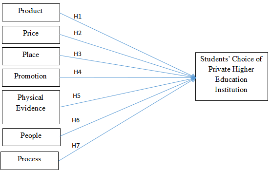 We used the marketing mix (7p) model that in our research to investigate the relationship between the marketing mix (7p) and students’ choice of PHEI in Malaysia. Besides, our research further investigates the significance of the 7p as a controllable tool to control the purchasing intention of customers.
