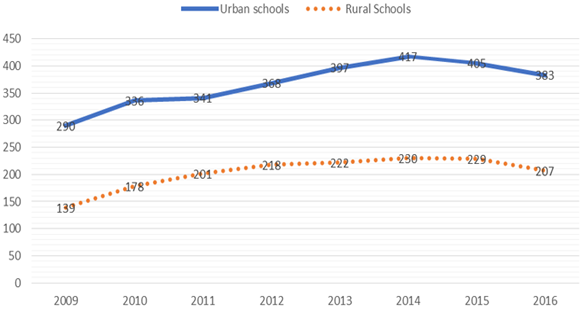 The result in Table 2 shows that the trend of enrolment of junior secondary schools in urban and rural areas increased consistently from 2008/2009 with an average of 290 for urban schools and 139 for rural schools to 2013/2014 with an average mean of 417 for urban schools and 230 for rural schools. In 2014/2015, enrolment trend in both urban and rural schools experienced a small decline with an average mean of 405 for urban schools and 229 for rural schools and continued declining slowly to 383 for urban schools and 207 for rural schools in 2015/2016. The analysis also indicates that junior secondary school enrolment was significantly high in urban schools than in rural schools in all the years covered except from 2014-2016. This is further illustrated in Figure 2. The result of the analysis in Figure 2 revealed that there was a steady increase in enrolment of urban and rural junior secondary schools in Akwa Ibom State from 2008/2009 up to 2013/2014 and declined from 2014/2015 and continued to fall in 2015/2016. This result also revealed that the increase in enrolment of urban schools was large and significant than that of rural schools in the state, in all the years in question.