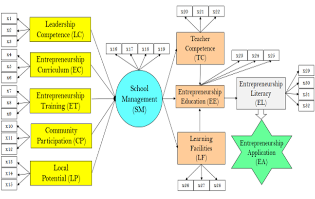Entrepreneurship education is recommended to be an element in the vision, commitment and seriousness of school management. It is also necessary to pay attention to the indicators that contribute the strongest value to each of the factors or variables that affect school management, and variables that are influenced by school management. The strongest indicators are leadership experience in LC variables, relevant learning facilities for EC, marketing system learning for ET, business capital assistance for CP, identification of business prospects for LP, support for practical learning for TC, utilization of environmental potential for LF, and system learning marketing towards EE.