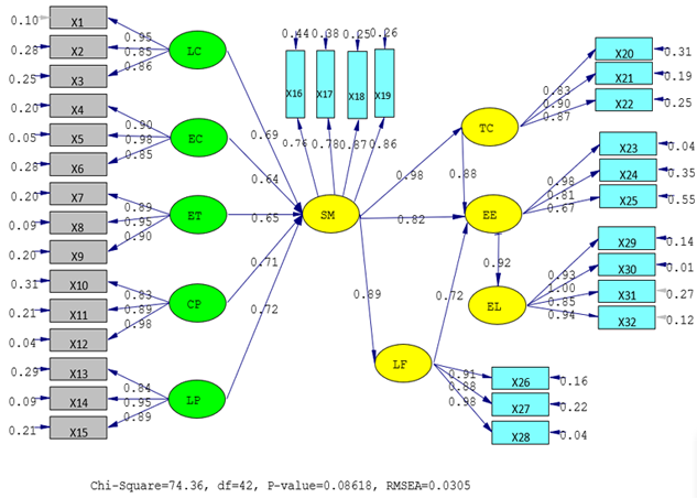 Furthermore, school management also has a positive effect on teacher competence (TC), learning facilities (LF), and entrepreneurship education (EE). The coefficient value of the strongest influence of school management on teacher competence is 0.89 and learning facilities is 0.89, while entrepreneurship education is 0.82. This result is understandable because teacher competence and the provision of learning facilities are elements that must be considered in school management, while entrepreneurship education is a function and responsibility of teachers. However, in graph 2 it can be seen that teacher competence and learning facilities also have a positive effect on entrepreneurship education with coefficient values of 0.88 and 0.72.