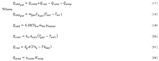 In the following the heat and mass transfer model is presented for the combustion chamber model. The flue gases are released after the biogas combustion. The radiation is the major heat transfer by-product because of the high temperature of the gas. However, other heat transfer mechanisms are present in the furnace heat transfer such as convective, evaporation and combustion and must be taken in consideration in order to solve the energy conversion equations of biomass incinerators (Saravanautto et al., 2001; Fargali et al., 2008; Chinda and Brault, 2012; Sami and Marin, 2017) .