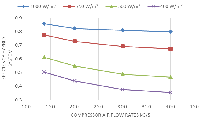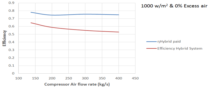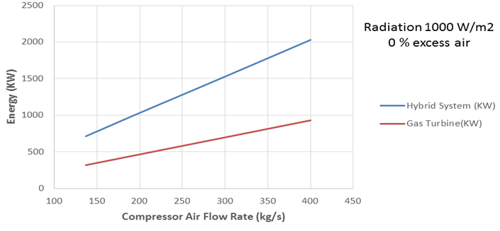 It is apparent from these figures that increasing air flow and consequently the flue gas flow rate enhances the output power produced by the gas turbine system and hybrid system. Furthermore, the higher the air flow rate the higher the efficiency of the gas turbine system with the compressor driven by PV solar panels. However, when taking into account the solar radiation converted by the solar panels the hybrid system efficiency diminishes with increasing the air compressor flow rate.