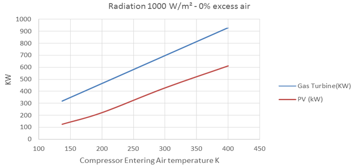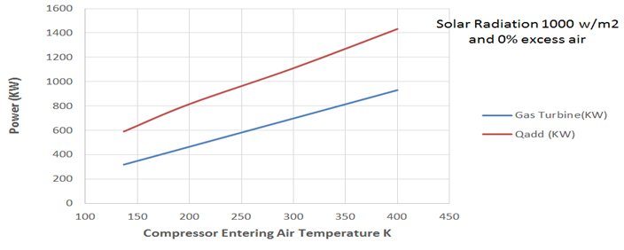 Figures 5 and 6 have been constructed to illustrate the impact of increasing the air flow temperature entering the compressor on the gas turbine performance while the compressor is driven by the PV solar at solar radiation of 1000 w/m2 and 0% excess air. The results displayed in these figures show that the higher the temperature of air flow rate entering the compressor the higher the power produced and the higher power consumed by compressor. This consequently increases the solar PV power required to drive the compressor. In addition, Figure.6 also shows that the higher the air compressor flow rate the higher the heat of combustion added in the gas turbine combustion chamber to ensure full combustion.