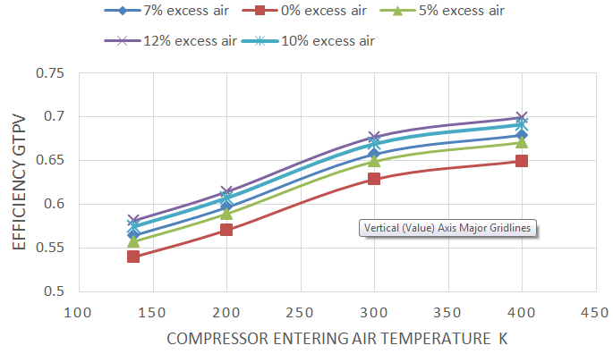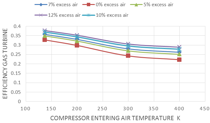 Equations (1) through (28) present the heat and mass calculation balance at the gas turbine, combustion chamber where the biogas is fed to the combustion chamber and the combustion process releases heat which is converted to the gas and ash through chemical reactions. The air flows to the compressor vary from 136.95 to 400 kg/s in this study with compressor entering temperature ranging from 288 to 481 K. It was assumed that the fuel air ratio was 0.10 and the maximum excess air ratio was 120% during the combustion process (Saravanautto et al., 2001). This is necessary to maintain the combustion chamber temperature exit within the range of 1433 °K to ensure complete combustion.