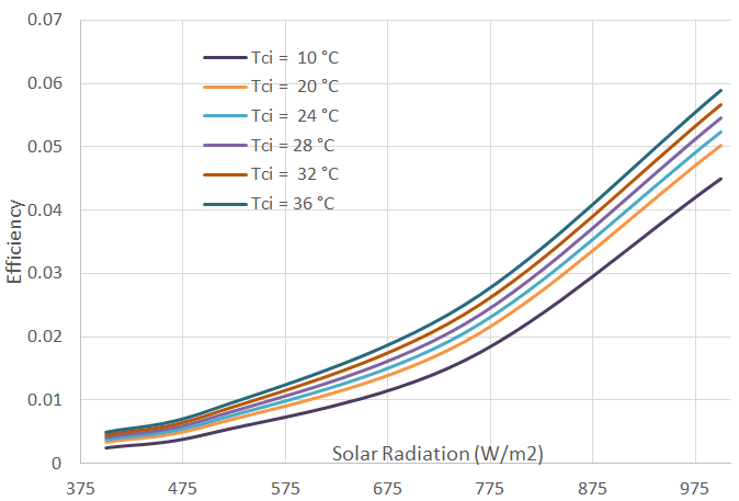 Furthermore, in order to study the impact of the initial PV cell temperature on the energy conversion process using equation (33), Figures 16 and 17 have been constructed. It is worth noting that the numerical simulation presented hereby include the variation of PV cell temperatures from 10°C through 38°C. Furthermore, Figure 16 presents the PV energy conversion efficiency for different initial cell temperatures. The data presented in this figure also illustrate that the higher the initial cell temperature the higher the PV the PV energy conversion efficiency and power produced which is consistent with Fargali et al. (2008) and others.
