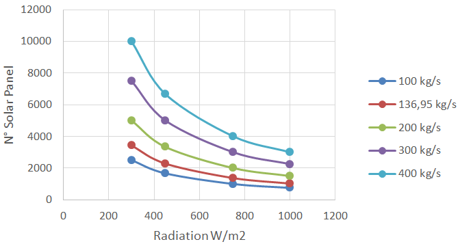 The number of PV solar panels was calculated to drive the compressor of the gas turbine at different conditions of air compressor flow rates at different solar radiations are displayed in Figure 20. The PV module characteristics and specifications employed were based upon data of Fargali et al. (2008) with total surface area of the PV module 0.99288 m2. It is quite evident from the data presented in this figure that at a particular compressor air flow rate the higher the solar radiation the less number of solar panels needed to drive the compressor at that particular flow rate. On the other hand, the results displayed in this figure also demonstrate that the higher the compressor air flow rate the higher number of solar panel needed to drive the compressor. This is significant since the air flow rate impacts the output power at the gas turbine end and consequently the efficiency of the hybrid system.