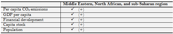 Table contains results for the sub-Saharan/North African and Middle Eastern panel. The value of ENRCt-1 (-0.0022) implies that energy consumption is corrected by (0.220) percent each year. The results show that the CO2 emissions are statistically significant at the 1% level. The magnitude of 0.056 implies that a 1% increase of the CO2 emissions increase energy consumption by 0.056%. It is found that economic growth has not a significant impact on energy consumption of the sub-Saharan/North African Middle Eastern panel. Similarly, the coefficient of financial development and capital are positively correlated (0.00020 and 0.053) but not significant. Finally, the coefficient of the population indicates that population has a significant and positive effect on energy consumption at the 1% level. A 1% increase in the population raises energy consumption by 0.519%.