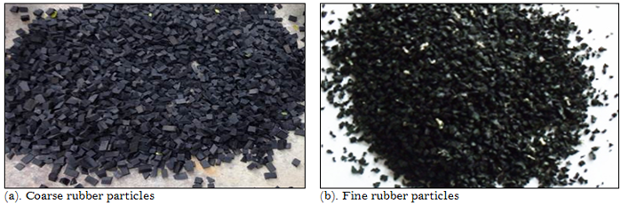 On the other hand, the consumption of natural aggregates (river sand, stone, etc.) for concrete production is rapidly increasing in countries around the world in order to meet the increasing needs of infrastructural development in the recent years. Due to the overexploitation in many countries, the availability of these natural aggregates has been decreasing (Rashad, 2013; Rashad, 2014). The increasing shortage of natural aggregates has created an opportunity for using by-products as fine aggregate. Reuse of waste rubber derived from discarded tires as a partial or full replacement of natural aggregates in construction activities not only reduces the demand for exploitation of natural raw materials, but also reduces environmental pollution problems associated with the disposal of discarded tires (Rashad, 2016). In this regard, a number of studies on the use of rubber aggregate derived from discarded tire for replacing natural aggregates in concrete have been conducted recently. Rubber aggregates are obtained from discarded tires using two different technologies: mechanical grinding at ambient temperature and/or cryogenic grinding at a temperature below the glass transition temperature (Eleazer et al., 1992; Nagdi, 1993). Although previous studies have achieved encouraging results, there are still several aspects related to the effects of replacing volume for traditional aggregates by rubber aggregate and the effects of size and shape of rubber particles on the mechanical properties of concrete, that need to be further studied. This paper presents the results of the first ever study in Vietnam which aims to explore the possibility to use rubber particles derived from discarded tire as aggregates for replacing fine and coarse natural aggregates to produce cement concrete. The study results are expected to promote the recycling activities for rubber from discarded tires towards resource recovery and environmental protection in Vietnam.
