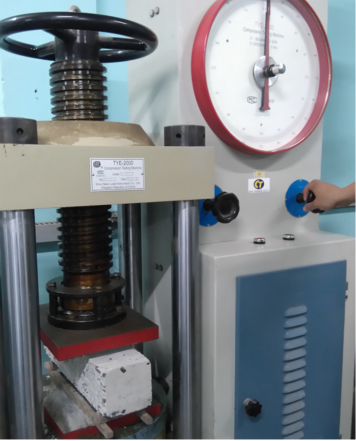 The compressive strength tests were performed for all mixes according to Vietnam Standard (1993b) in order to evaluate the effect of fine and coarse aggregate replacement with fine and coarse rubber particles, respectively on the compressive strength of hardened concrete. Mix proportions used to prepare specimens for the compressive strength tests were those presented in Table 1. One set of three cubic specimens with a side of 150 mm was realized for each mixture studied. The specimens were cast using appropriate moulds placed on a vibration table for 60 seconds in order to obtain a more homogeneous distribution of rubber particles in the concrete mix. After casting, the moulds were left to cure for 24 hours. Once hardened, the specimens were accurately demoulded, placed in a curing room at a relative humidity of 75% and a temperature of 27 ± 2 °C until testing time. The compressive tests were then carried out for both 7 and 28 day aged specimens by an oil-pressure machine under loading control with a capacity of 3,000 kN and the loading rate of 0.4 MPa/s (Figure 4).